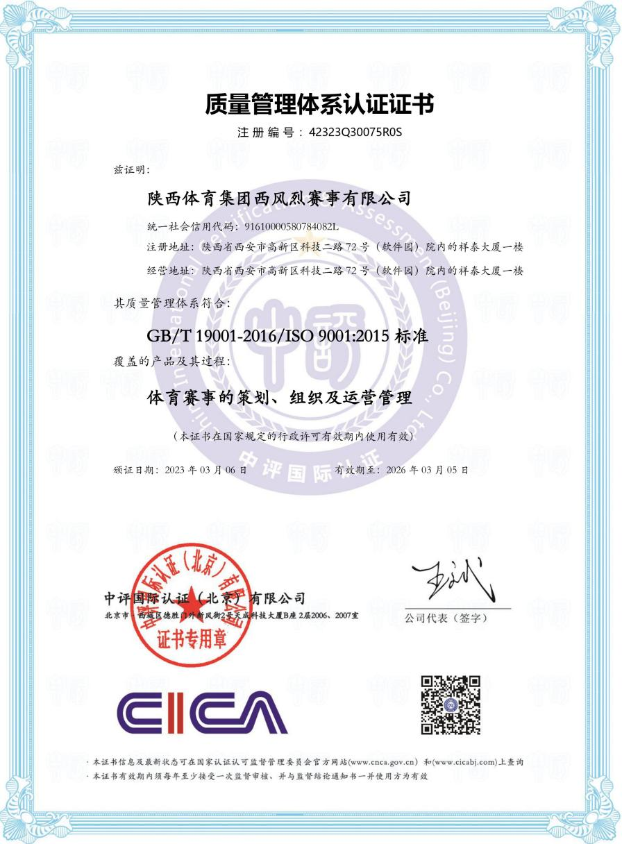 近日,陜西體育集團西風烈賽事有限公司(簡稱“西風烈賽事公司”)經評審專家嚴格審核,順利通過ISO9001質量管理體系認證并正式獲得認證證書,標志西風烈賽事公司的體育賽事策劃組織及運營管理水平已經達到國際認可標準。