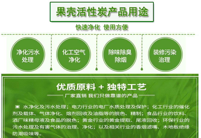 家居裝修應(yīng)用:產(chǎn)品采用優(yōu)質(zhì)果殼、椰殼為原料,無毒、無害,能有效吸附家居裝修過程中產(chǎn)生的甲醛、甲苯、氨類等有毒氣體,安全、凈化居室空氣。